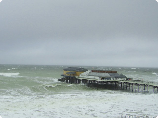 The summit gorse, though, gave me a cosy and sheltered spot out of the wind and rain and I actually dozed off for half an hour during which I was visited by Kylie , but as she was with Jason, I woke up. The rest of the walk into Cromer was fast and wind-assisted with a slight backward-leaning gait. And, there it ended, just near the pier. Huge waves were battering the sea-front and the gaps between buildings held localised hurricanes. There were damaged brollies on the streets. In celebration I had tea and cake in a cafe.