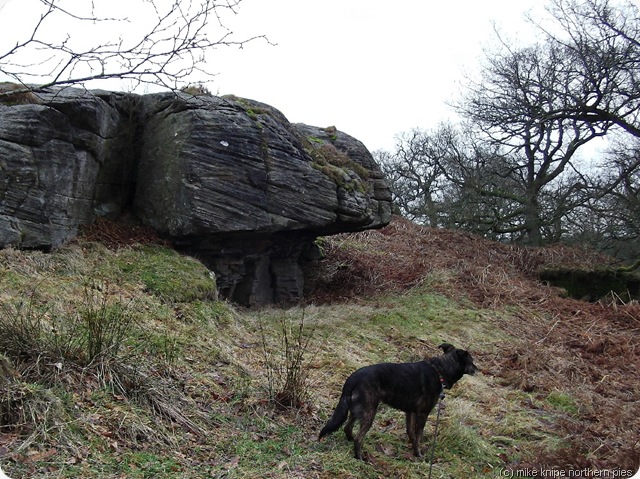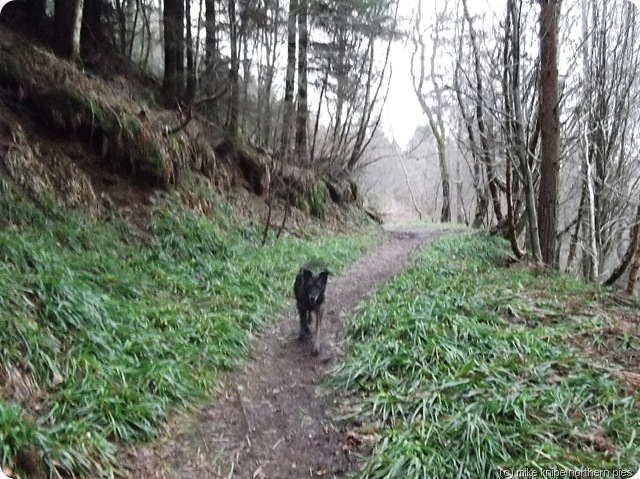 And so, we turned up on the Cumbria/Northumberland border just above West Allendale and sploshed off over the soggy moor in the general direction of The Dodd. The Dodd is a boggy Pennine just over 2000 feet high and, as the cloud base was around 1800 feet, it was a tad murky on the top. I had to navigate to find the summit cairn. This failed. So I switched on the yellow GPS thingy and put in the grid reference. This failed as well There was no cairn where it said the top was. So, instead I wandered off to the East in search of the bridleway that runs down Middle Rigg – and, found the summit cairn. Bruno took the opportunity of each pause for navigation to eat the remaining patch of snow/ice. He and his kind may well be responsible for the retreat of arctic ice. Has anybody checked the pack for teeth marks, I wonder?