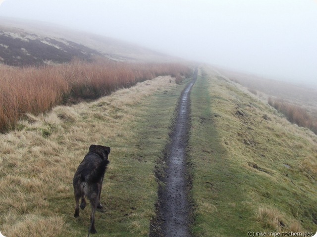 Anyway, last week, me and superdawg parked in the Dales centre, wandered up Stanhope Dene in icy drizzle, used the right of way which crosses and recrosses the beck, just to see what it was like (wet and slippy), up to the CtoC railway line where it was doing the snowy equivalent of drizzle, on to Park Head, where it started to blow a hoolie, down the incline where the blizzard started, along Crawleyside Edge where I couldn;t find shelter for me cheese butty and the dog was shivering, and down Shittlehope dene which was a bit more sheltered. This was a reccy for the proper walk which happened yesterday.