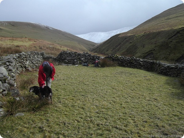 I’d encountered a bit of a blizzard and some lovely hillfog on the drive over the A66 a bit earlier, so I was somewhat aware of what the conditions on the high tops might be like. As it was, they were shrouded in mist but as we blundered ever upwards into the more frozen variety of snow, it became obvious that the climate would be less than idea for a long walk with a late start and what with having nothing spiky to wear on the feet. So we just got to the top of Arant Haw, at just under the hillfog and just underer the 2000 foot mark, selected a nice descending ridge and followed it down to a sunny and relatively tropical sheepfold where pies and pickles were scoffed.